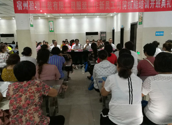 宿州盈德服裝有限公司服裝制作新員工崗前技能培訓班開班典禮于2018年6月12日下午18時30分在盈德服裝公司隆重舉行。開班典禮由宿馬園區(qū)人力資源服務中心副主任姜勇主持,姜勇副主任首先介紹參加此次開班典禮的領(lǐng)導,宿州市人力資源社會保障局職業(yè)能力建設(shè)科蔣永新科長和張欣科長:宿馬工業(yè)園區(qū)人力資源服務中心梁樞主任;宿州東潤職業(yè)培訓學校張立今院長和李群部長;宿州盈德服裝有限公司王紅娟廠長和二百多名職工。