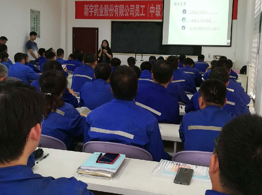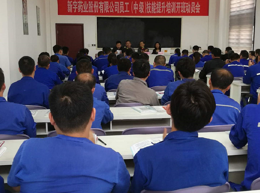 新宇藥業(yè)股份有限公司微生物發(fā)酵工、生化藥品提取工、化學(xué)合成制藥工(中級)技能提升培訓(xùn)開班動員大會典禮于2018年5月9日 下午14時30分,在新宇藥業(yè)股份有限公司培訓(xùn)教室隆重舉行 。