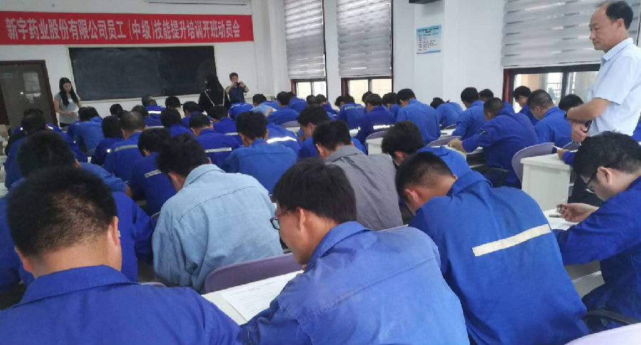 2018年9月18日下午,新宇藥業(yè)股份有限公司制藥加工工技能提升培訓結(jié)業(yè)考試在新宇公司培訓室舉行,人力資源與社會保障局蔣永新科長和新宇藥業(yè)人力資源部張佑民部長親臨考場督查。