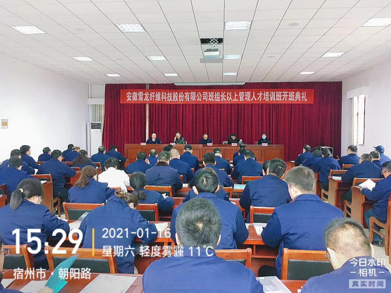 2021年1月16日下午三時(shí)許,安徽雪龍纖維科技股份有限公司班組長(zhǎng)以上管理人才培訓(xùn)班開(kāi)班典禮在雪龍公司五樓會(huì)議室隆重舉行。宿州市高層次人才工作站劉成龍主任、安徽雪龍纖維科技股份有限公司董事長(zhǎng)陶振家、安徽雪龍纖維科技股份有限公司總經(jīng)理、人力資源總監(jiān)陶春昊、宿州東潤(rùn)職業(yè)培訓(xùn)學(xué)校副書(shū)記李群出席開(kāi)班典禮,全體學(xué)員參加,儀式由陶春昊主持。