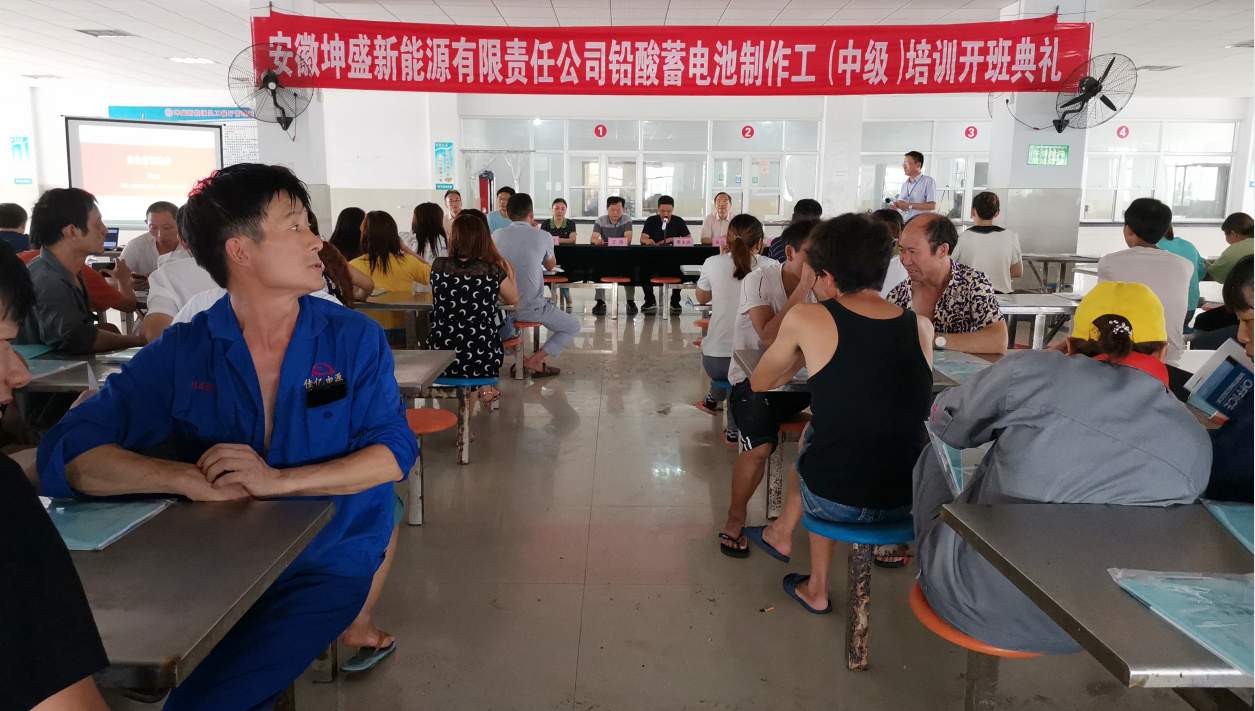 安徽坤盛新能源有限責(zé)任公司鉛酸蓄電池制造工(中級(jí))崗位技能提升培訓(xùn)班開班典禮于2019年8月8日上午10時(shí)30分,在安徽坤盛公司隆重舉行。